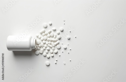 © Pete, Naklejka premium White medical pills spill from open bottle onto clean white surface. Various tablets and capsules scattered across the backdrop. Isolated pharmaceutical products await use for recovery or pain relief.