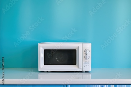© Ruslan, Fototapeta premium White microwave near blue wall on counter