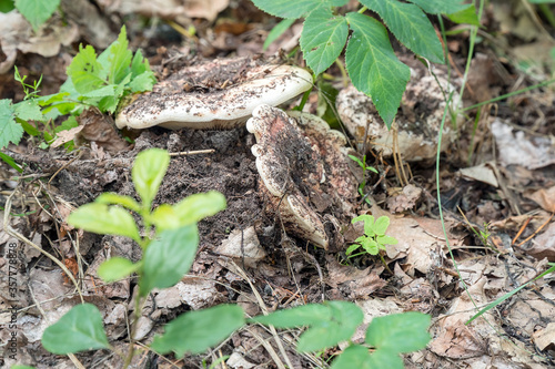 Fototapeta premium White milk mushroom grow from the ground in the forest