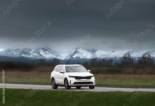© AlexGo, Fototapeta premium White modern car. Truck with up-to-date safety features.