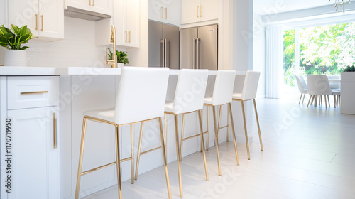 © Bonsales, Fototapeta premium White modern kitchen with gold details featuring bar stools around a marble countertop, showcasing a sleek and stylish interior design