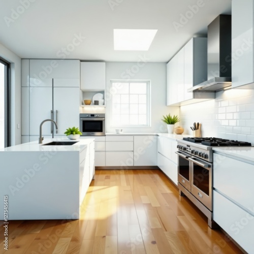 Fototapeta premium White modern kitchen with stainless steel appliances, sleek, futuristic,...