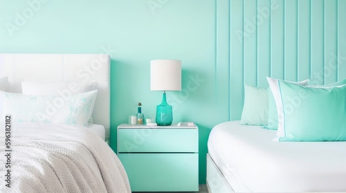 © Shamim Akhtar, Fototapeta premium White modern mid-century bedside table, bed, embroidered pillowcase in sunlight on turquoise blue pastel green wall bedroom.