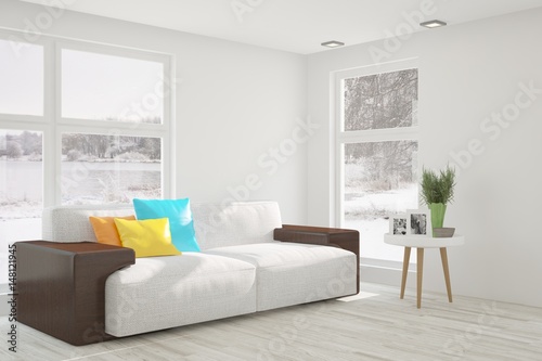 © AntonSh, Fototapeta premium White modern room with sofa. Scandinavian interior design. 3D illustration
