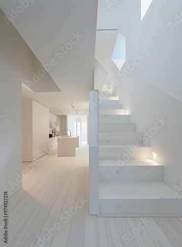 Fototapeta premium White Modern Stairs with Kitchen in Background