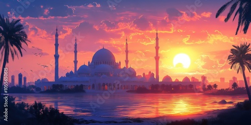 © Ali, Fototapeta premium White mosque silhouette against sunset sky.