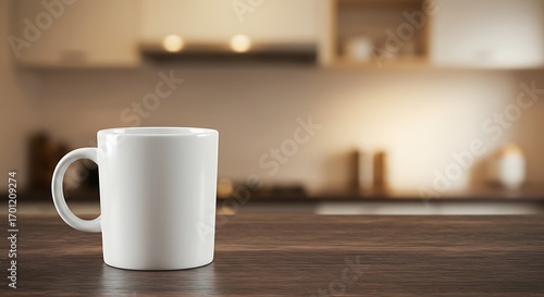 Fototapeta premium White mug on a wooden table in a warm kitchen setting.