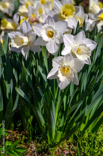 Fototapeta premium White Narcissus flowers with six petals and a yellow middle bloom in the spring
