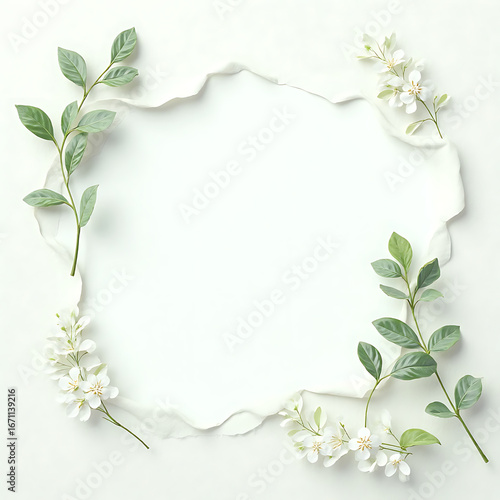 © Nuningkw, Fototapeta premium White Natural Fiber Paper Texture with Green Leaves
