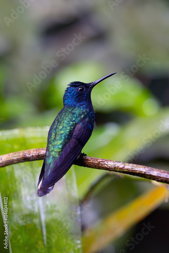 Fototapeta premium White-necked Jacobin (Florisuga mellivora), colorful hummingbird sitting on a branch with a green background. Typical hummingbird of Central and South America with a blue head.