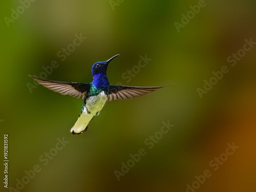 © FotoRequest, Fototapeta premium White-necked Jacobin Hummingbird Hovering In Flight Against Green Background