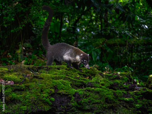 Naklejka premium White-nosed Coati foraging on mossy stone
