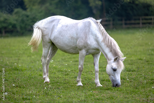 © J.Woolley, Fototapeta premium White or grey mare pony grazing in her paddock on a wet day, Image shows a beautiful horse grazing in it's field on a rainy day in Surrey