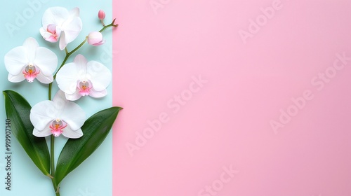 © Photopia, Naklejka premium White orchid flowers with green leaves on pastel pink and blue background with copy space. Flat lay floral composition, perfect for designing greeting cards, invitations, banners, and wedding marketin