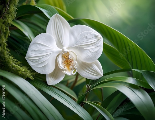 © Aidan, Obraz premium white orchid nestled among lush greenery on white branch foliage greenery