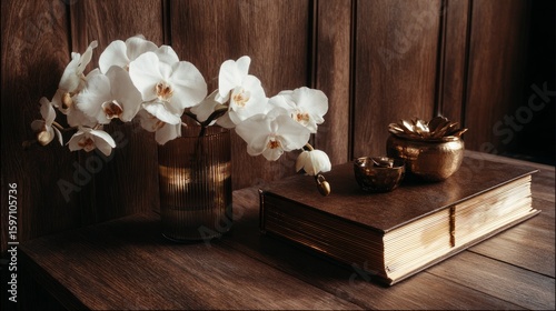 Fototapeta premium White orchids and book arrangement