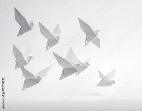 © ainun, Fototapeta premium White Origami Birds in Flight Against White Background