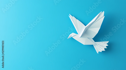 © Thiago, Obraz premium White origami pigeon on a blue paper background, peace or freedom concept, paper art work. Peace - River. Illustration