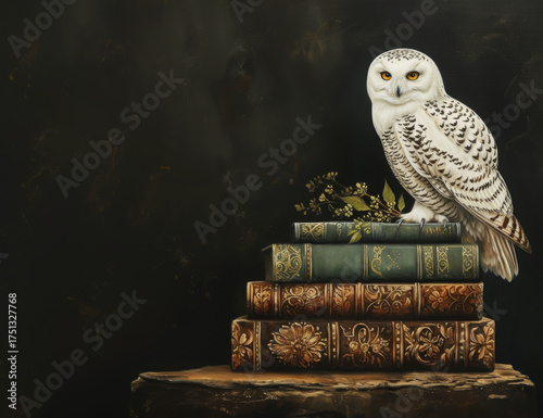 Fototapeta premium White Owl Sitting on Old Books Background with Copy Space