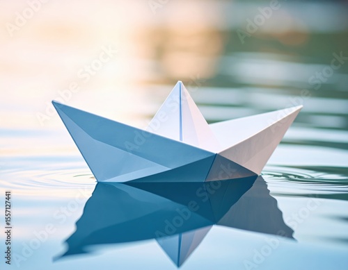© Ayu, Obraz premium White Paper Boat Floating On Water