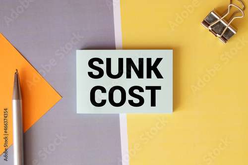 © Uladzislau, Obraz premium White paper card with text SUNK COST sheet of white paper for notes.