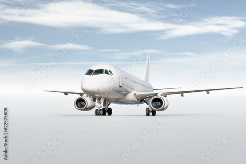 Obraz premium White passenger aircraft isolated on bright background with sky
