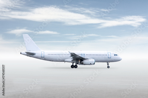 Fototapeta premium White passenger airliner isolated on bright background with sky