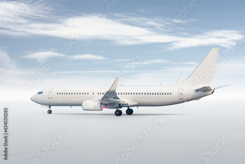 Fototapeta premium White passenger airliner isolated on bright background with sky
