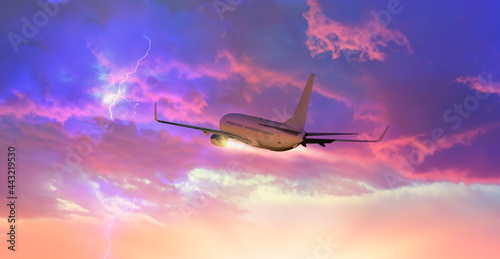 Fototapeta premium White passenger airplane over the clouds at amazing sunset - Travel by air...
