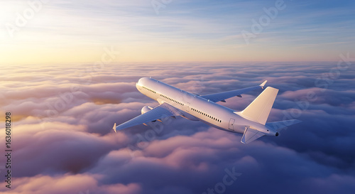 © Faris, Fototapeta premium White Passenger Airplane Soaring Above Clouds at Sunset.