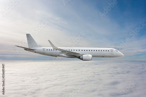 © Dushlik, Obraz premium White passenger jet plane flies in the air above the clouds