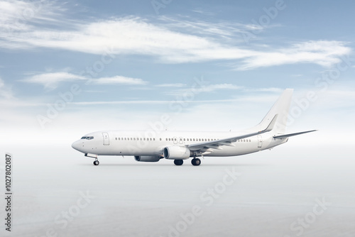 Fototapeta premium White passenger jet plane isolated on bright background with sky