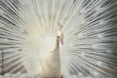 © osman, Fototapeta premium White Peacock. Close-up of a colorful peacock spreading its wings and ornate feathers.