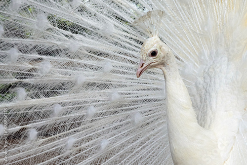 Obraz premium White Peacock. Close-up of a colorful peacock spreading its wings and ornate...