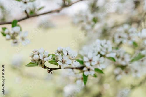 © Sandra, Obraz premium White pear blossom bud fertile, pear tree in spring, sunny day, blue sky