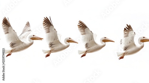 © NAIMAH, Obraz premium White pelicans flying sequence, wildlife, nature, isolated, motion blur background