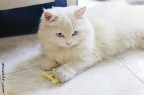 © Punyaphat, Naklejka premium white persian cat is playing with yellow clothespin on ceramic floor