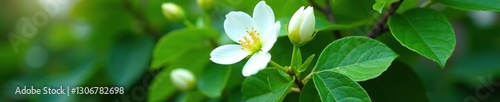© methinee, Fototapeta premium White petals unfolding from tightly closed buds on a dense green shrub, blooming, blossoms