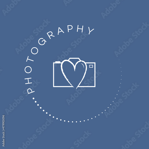 © Elke, Obraz premium White photography stamp logo on a blue coloured background. Wedding photographer logo. With love camera icon. Romantic logo design. Hand drawn stamp icon.