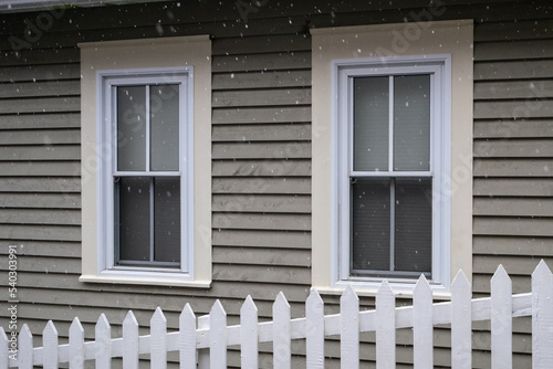 Fototapeta premium White picket fence on a diagonal in the foreground with a tan colored house in the background. There are two white double hung windows with beige trim on the exterior wall of the country style home.