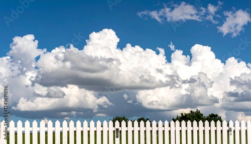 Fototapeta premium White picket fence under a vast, fluffy sky