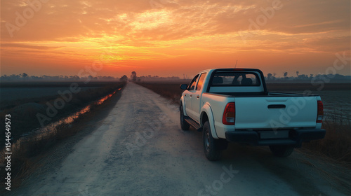 Fototapeta premium White pickup truck on a quiet rural road at dusk, bathed in golden light,...