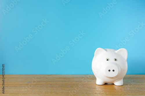 © tendo23, Fototapeta premium White Piggy bank on blue background with copy space