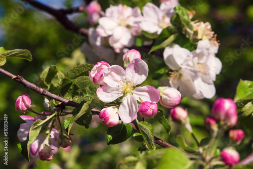 Obraz premium White pink blossoms and buds of an apple tree in spring.