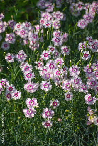 © Lukeriya, Naklejka premium White-pink chinese carnation in gardens after rain on a summer day.