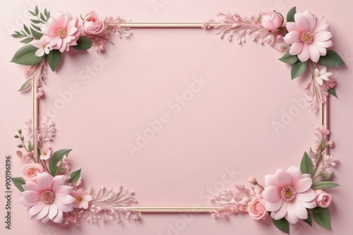 Obraz premium white pink floral frame with delicate blossom and green leaves for spring card design on pink background