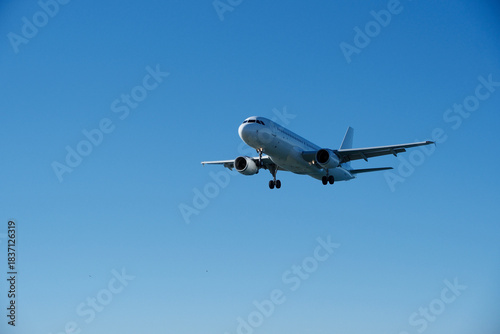 © Maksim Mikhailov, Obraz premium White Plane Approaching Runway Against Blue Sky