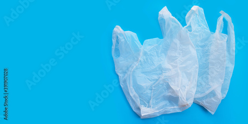 Fototapeta premium White plastic bags on blue background. Copy space