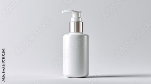 © Tiwakeat, Obraz premium White plastic bottle with silver pump dispenser on a solid light gray background