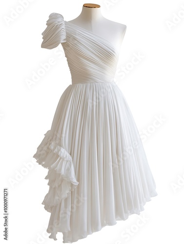 © NatthaphonSiri, Fototapeta premium White Pleated One Shoulder Dress with Ruffles.